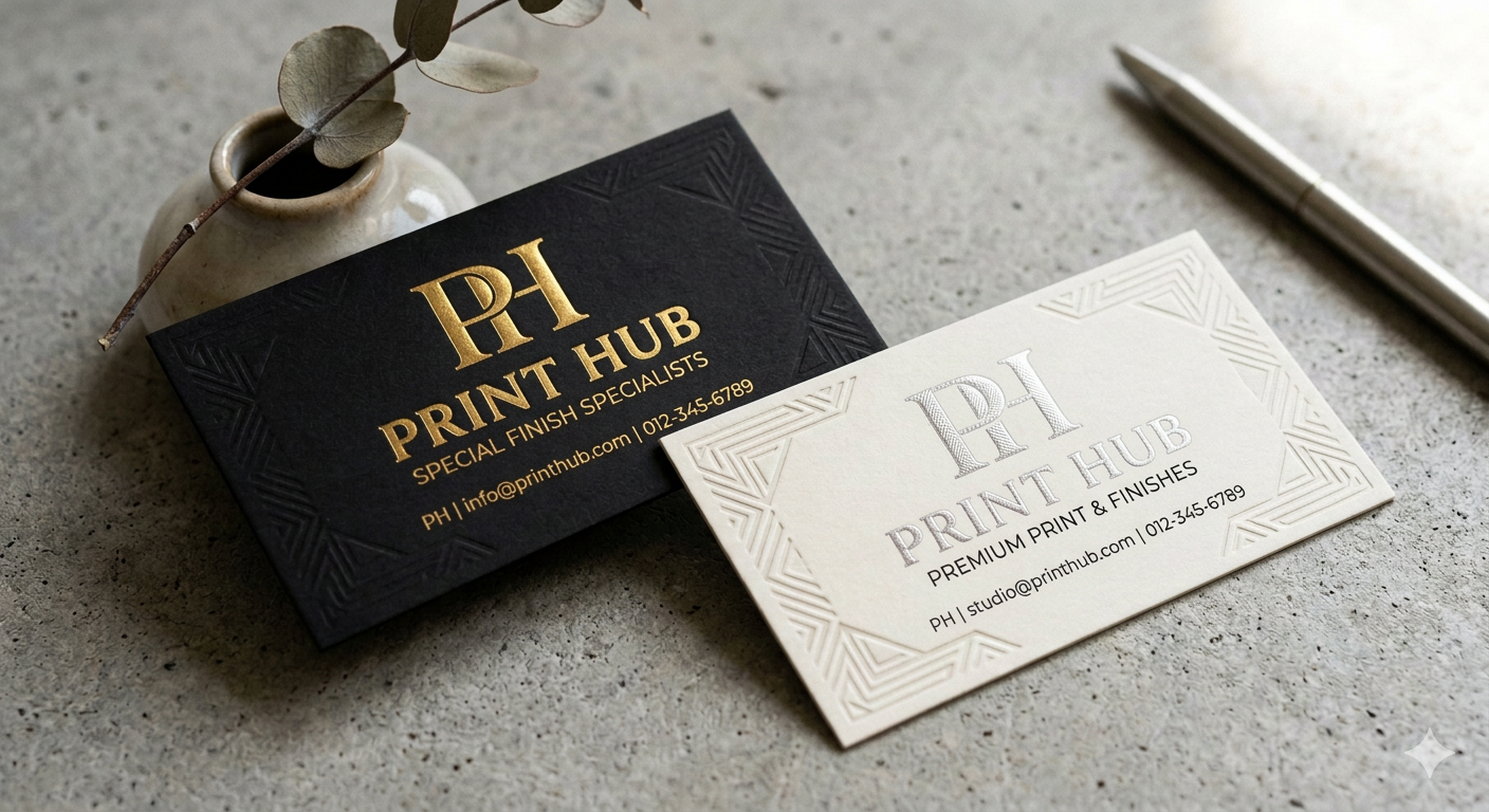 Already have your design ready. Upload your PDF file and print embossed business cards or foil business cards directly online. With fast turnaround times and unmatched print quality, Print Hub helps your business stand out with every card you hand out.